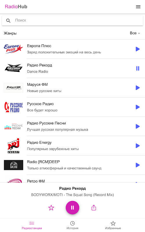 Бесплатное радио России в приложении RadioHub дает тебе возможность выбирать самые любимые и популярные российские радиостанции. Слушать радио онлайн очень удобно благодаря понятному и простому интерфейсу. Достаточно нажать одну кнопку – и радио онлайн бесплатно и неустанно будет развлекать тебя сколько пожелаешь.