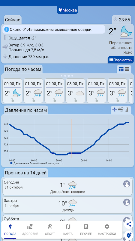 圧力、風、気温の時間別および日別の詳細なグラフ。環境、アレルギー指標、空調に関する情報。スポーツファン向けに、気象条件の影響を説明する条件指標が提供されます。表示する多くのレイヤーとその他の追加情報を備えた天気図。