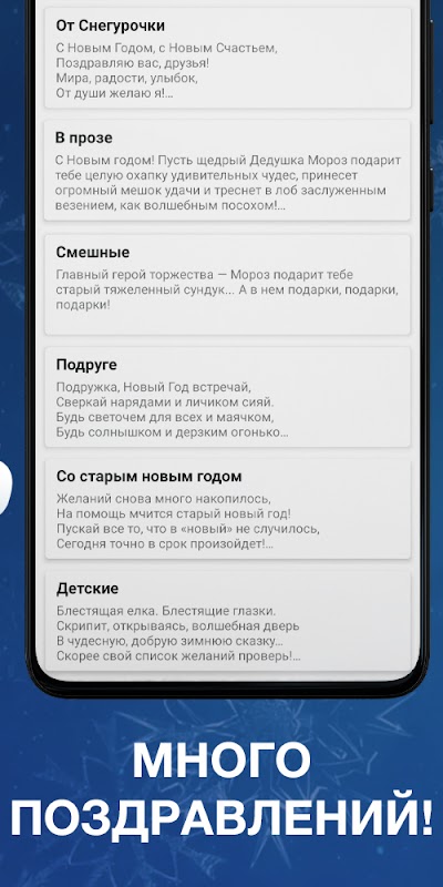 新年の前夜、私たちは皆、愛する人それぞれの生活にできるだけ多くの喜びと慰めをもたらそうと努めます。アプリケーション「新年おめでとうございます」は、最も温かく誠実な新年の挨拶を選ぶのに役立ちます。両親、友人、同僚、愛する人など、誰を祝福したいとしても、私たちのアプリケーションで完璧な言葉がきっと見つかります。