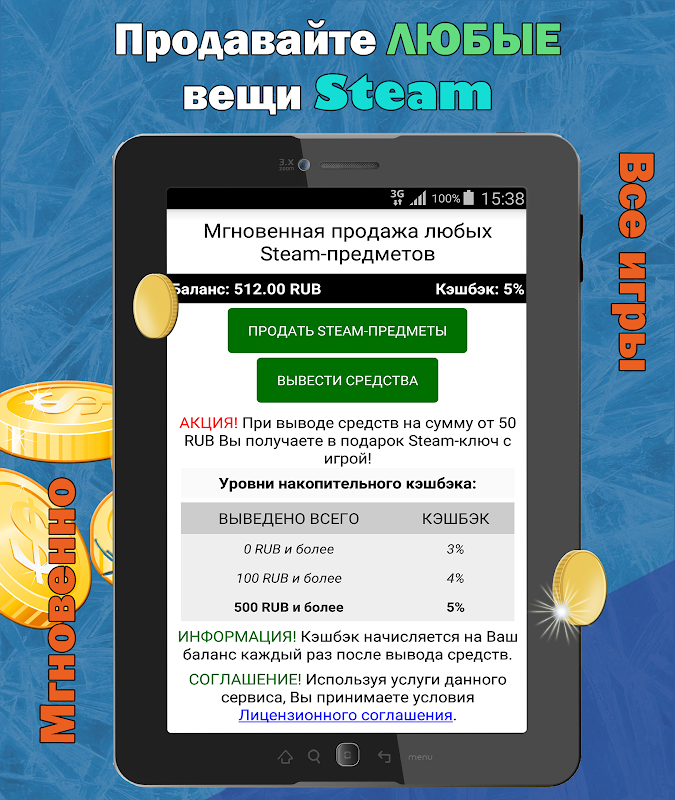 Мобильное приложение для мгновенной продажи Steam-предметов кс го, дота 2 и других игр, а именно скинов, карточек, кейсов любых игр. Вывод средств деньгами и Steam keys (ключами от цифровых продуктов). Самый простой заработок на играх с помощью продаж стим-предметов Dota 2, skins CS GO за реальные деньги. Избавляйтесь от ширпа, выполняйте обмены и получайте прибыль за каждый трейд, обмен. Зарабатывайте новым выгодным и честным способом на Стим шмоте.