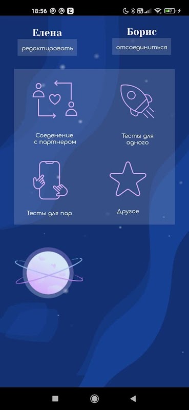 アプリケーションは2つのデバイス用にダウンロードする必要があり、一方のパートナーが他方のコードを入力する必要があり、あなたはパッセージに進むことができます。最良の効果を得るには、お互いの答えについて話し合うことについて聞くために、一緒にテストに合格することをお勧めします。だから、あなたはあらゆる側面からお互いを知り、あなたがどれだけ一緒になっているか、そしてあなたがまだ関係やあなた自身に取り組む必要がある場所を理解するようになります。このテストは、心理療法士によって、人々のニーズ、習慣、およびすでに確立されている見解と経験に基づいて開発されました。したがって、彼はあなたにとって一種のレセプションであり、心理学者との関係のテストになるでしょう。がんばろう!