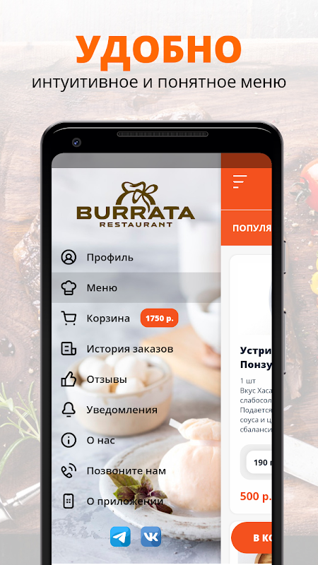 私たちのアプリケーションの助けを借りて、あなたはヴォログダで配達されたブッラータレストランから既製の食べ物を注文することができます。