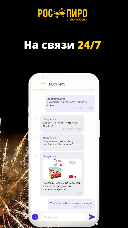 24時間年中無休のサポートサービス。彼らはあなたがどんな質問でも解決するのを手伝います:花火に正しく火をつける方法、緊急事態で何をすべきか、花火を発射する適切な場所を選ぶ方法、そして法的要件は何ですか。