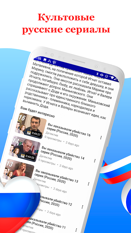 アプリケーション「ロシアの連続活劇」は、私たちの映画を最大限の快適さで見ることができるオンライン映画館です。 サブスクリプションなしでロシアのテレビシリーズをオンラインで無料で視聴する機会があります。オペレーティングシステムのバージョンに関係なく、スマートフォンやタブレットでの使用に適しています。このアプリケーションには、次のようなさまざまなジャンルのロシア語の連載が含まれています。