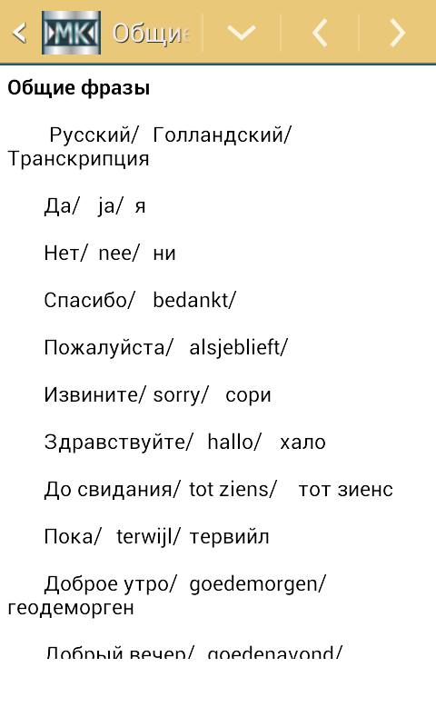 Русско-голландский разговорник. Предположим, вы приехали в другую страну и совершенно не владеете местным языком. Для того, чтобы проще общаться за рубежом и чувствовать себя как дома, предлагаем пролистать перед поездкой разговорник. В данном разговорнике вы найдете общие фразы и фразы на темы гостиница, магазин (покупки), транспорт, экстренные случаи, ресторан.
