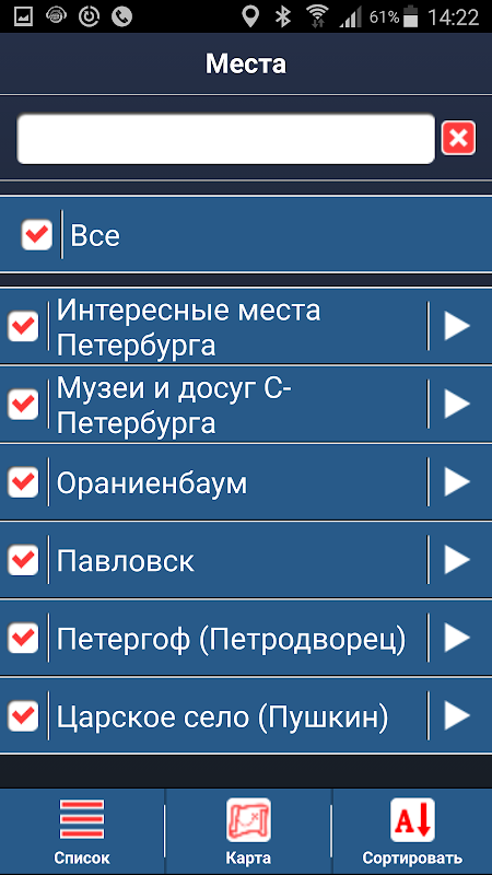 ● サンクトペテルブルク散策。北の首都サンクトペテルブルクの魅力的なスポットすべてが観光ルートに含まれるわけではありません。カタログからご希望の場所を選択するだけで、サンクトペテルブルクのウォーキングツアーを作成できます。選択したスポットはすぐに地図上に表示されます。他のオブジェクトを一時的に非表示にすることもできます。