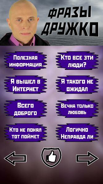 Перед вами приложение на случай важных переговоров! Вам нужно ответить другу колкой или популярной фразой Сергея Дружко во время жаркого спора? Или разыграть вашего друга? Устроить ему пранк? В любой момент используя это приложение вы сможете сделать это! "Сильное заявление", "Хайпанём немножечко", "Я вышел в интернет с таким вопросом", и многие другие мемы и популярные цитаты Сергея Дружко вы найдёте в приложении его фраз и мемов!