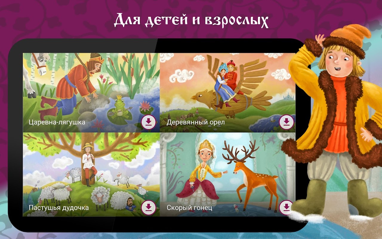 Простое и удобное приложение с русскими народными аудиосказками. Каждая сказка снабжена ярким стилизованным графическим сюжетом. Есть возможность скачать и прослушать офлайн.