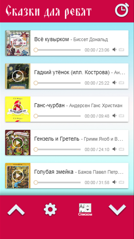 Большая аудиотека сказкок со всего света. Более 250 произведений: сказок, стихов, детских рассказов. В числе прочих в приложении представлены такие авторы, как: Ганс Христиан Андерсен, братья Гримм, Николай Носов, Михаил Пришвин, Корней Чуковский, Амадей Гофман, Александр Пушкин и многие другие. Реализован таймер, чтобы ребенку было удобней засыпать, тёмная тема для ночного режима чтобы не напрягать глаза. Аудиоплеер может работать в фоне и при выключенном экране устройства, а вплывающий список позволит быстро найти полюбившийся трек.