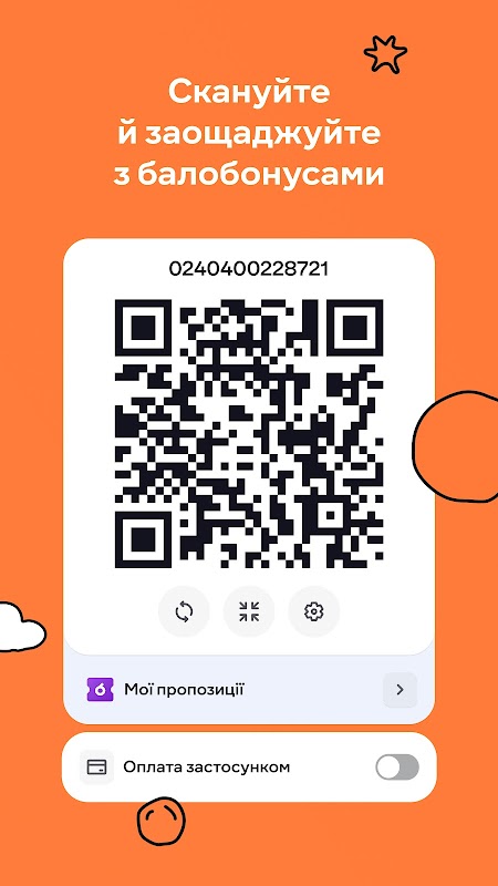 「Own Account」電子カードはいつでもあなたのそばにあります。「Silpo」でお買い物をするたびに、レジでQRコードをスキャンして特典を獲得しましょう。アプリに銀行カードを追加し、QRコードでお支払いください。