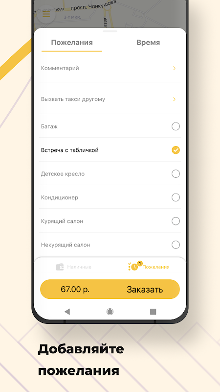 注文に追加のリクエストを追加してください。たとえば、外気温が +35 の場合は、「エアコン」を選択します。タバコのにおいが苦手な方は「禁煙サロン」を選択していただければ、禁煙ドライバーがお迎えにあがります。