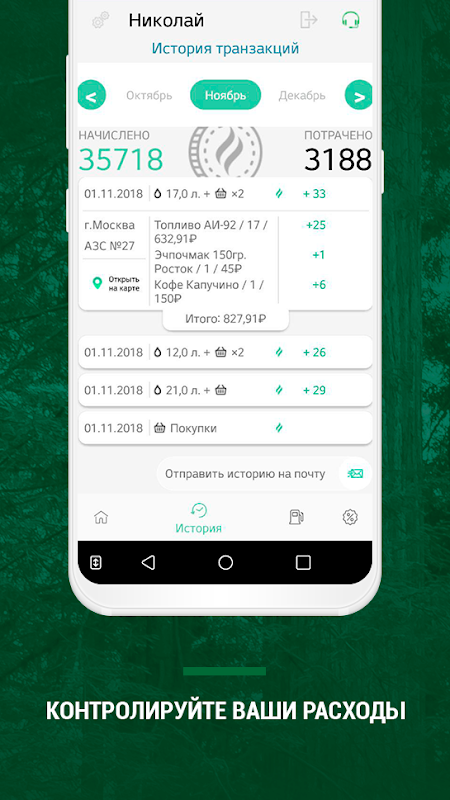 • следить за расходами, историей покупок и количеством начисленных баллов;