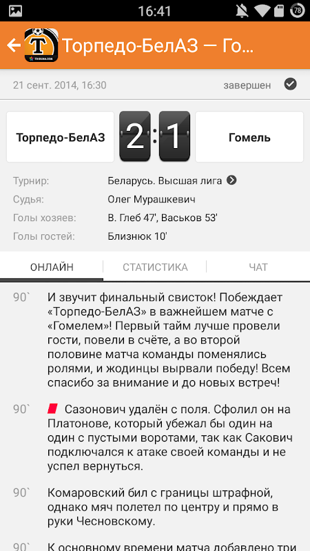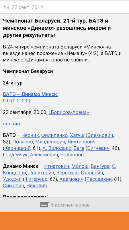 – Текстовые трансляции матчей, календарь и таблицу чемпионата Беларуси по футболу