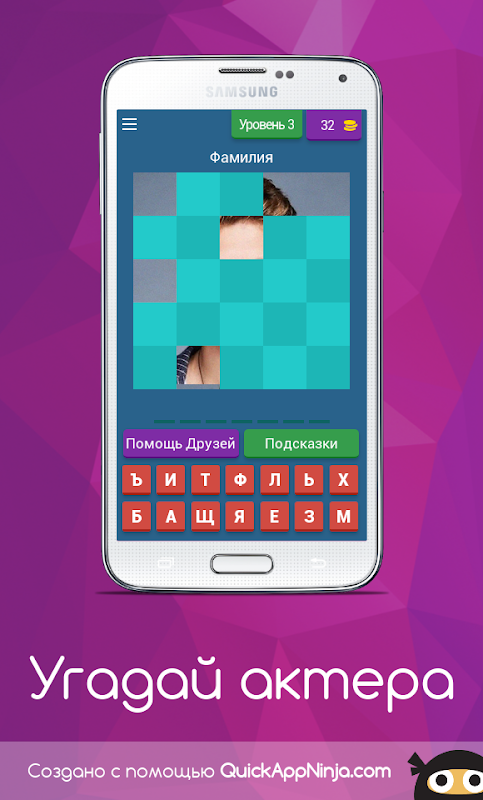 Угадай российского актера - это классическая андройд-викторина, в которой тебе предстоит угадать знаменитых актеров по фотографии. Фотографии актеров скрыты за плитками. Постарайся угадать фамилию актера, открыв как можно меньше плиток. Чем меньше плиток ты открываешь, тем больше монет получаешь.