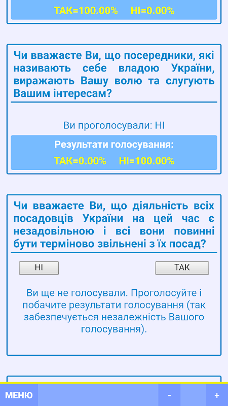 Результати голосування будуть публікуватися на правозахисних порталах http://PRESSA.TOP, http://NAROD.TOP, http://VOLYA.TOP {...} та будуть використовуватися для реалізації народовладдя (демократії) і соціальної гармонії (справедливості)!