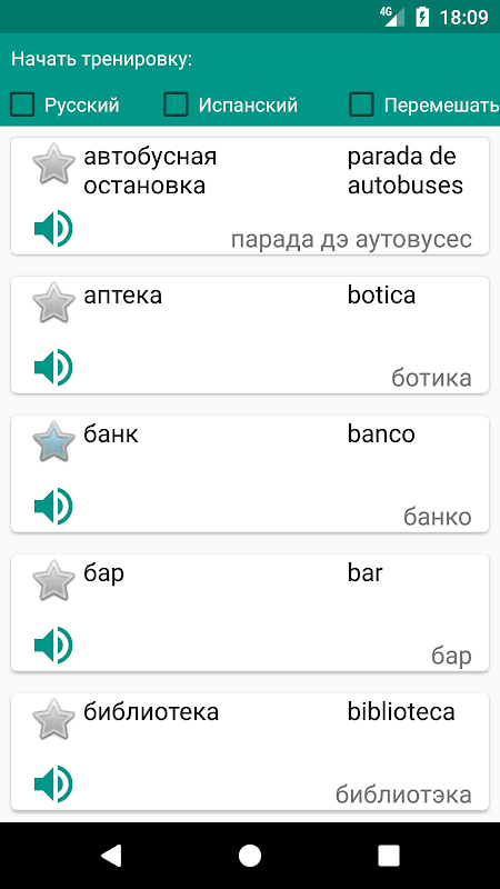シンプルで便利なワークアウトモード。興味のあるトピックを開き、単語を学びます。 「ロシア」でトップのマークで設定し、チェックを自分で決めるときはチュートリアルやアウトラインあなたの目の前にいるかのようにロシア語単語のみ残り、あなたは自分自身を確認するために、閉じた翻訳を渡します。あなたは単語を翻訳することができますか? -Excellentは、次へ進んでください。あなたが転送したり、疑うことができないのですか? - そこに右の単語であると、アプリケーションが単語の翻訳を開きます行をクリックします。同様に、「スペイン語」にチェックマークを付け - スペイン語と転写に言葉だけのまま。単語を学習するためのもう一つの便利な機能:あなたは「シャッフル」フィールドにマークを付けた場合、話題の言葉では、ランダムな順序で表示されます。
