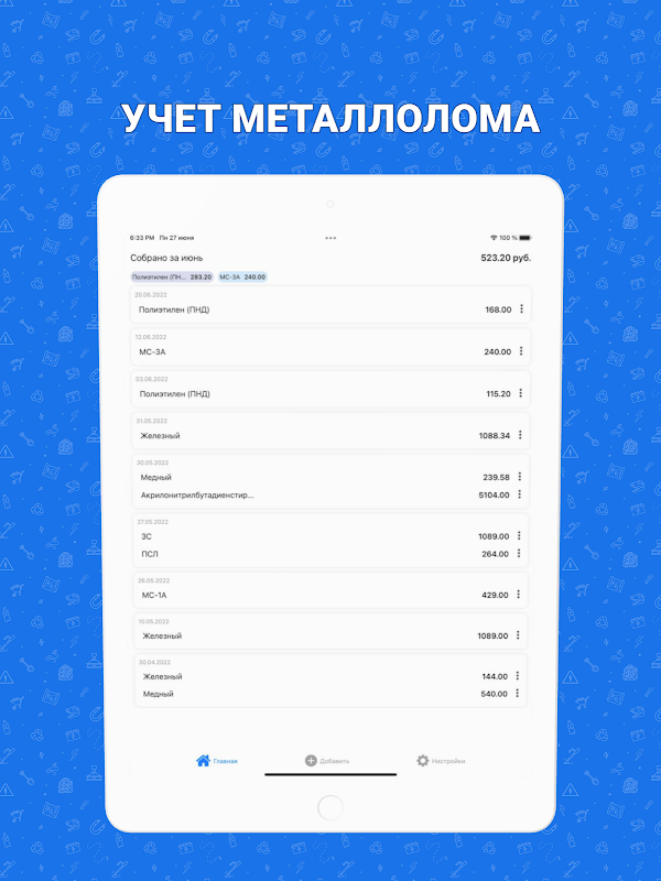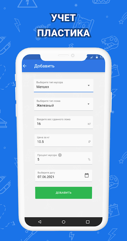 廃棄物の個別の収集と配送を会計処理するためのアプリケーション。追加する際に、古紙、ガラス、テトラパック、金属を提出した日付を指定できます。重量をキログラムで示します。これは、鉄金属(または非鉄金属またはプラスチック/古紙/ガラス)を渡した1kgあたりの価格です。ごみの割合を指定することもできます。そうすると、この量が合計から自動的に差し引かれます。したがって、どれだけ、いつ、どのような種類の廃棄物を収集したか、どれだけ手渡したかを節約できます。ダッシュボードのメイン画面では、すべてが今月の廃棄物の種類ごとに要約されています。将来的には、あなたはあなた自身の期間を選ぶことができます。