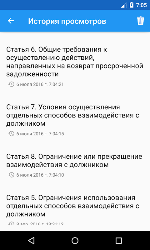 - История просмотров: приложение хранит историю просмотра статей, формируя список и сортирую историю по дате просмотра