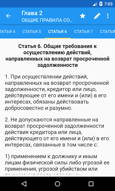 Приложение представляет собой удобный справочник по Федеральному закону РФ «О защите прав и законных интересов физических лиц при осуществлении деятельности по возврату просроченной задолженности и о внесении изменений в Федеральный закон «О микрофинансовой деятельности и микрофинансовых организациях» или же проще - закон о коллекторах. Приложение содержит полный текст закона, актуальный на данный момент времени (с изменениями от 03.07.2016).