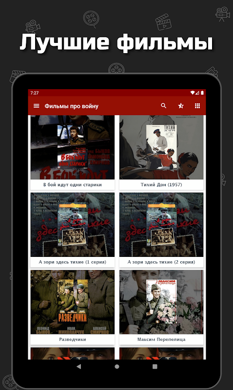 大祖国戦争は国の歴史に深い痕跡を残しました。戦争に関するソビエト映画は、ソビエト人の偉業の歴史、第二次世界大戦(大祖国戦争)の歴史を最もよく伝えます。戦争申請に関する映画のコレクションは、大祖国戦争時代の映画やテレビ番組だけでなく、内戦時代の戦争やその他の紛争に関する映画もあります。アプリケーションの映画は、5月9日または2月23日だけでなく、ソビエトの戦争映画をいつでも見るのにも適しています。結局のところ、ロシアの戦争映画は、数十年と数世紀の間、私たちの人々の難しい話です。