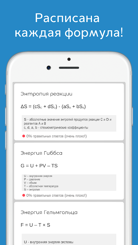幾何学の公式は OGE や統一州試験にも適しています。各公式の下には詳細な説明があり、各文字に署名があり、その公式をどの程度知っているかを示すパーセンテージと色のインジケーターも付いています。