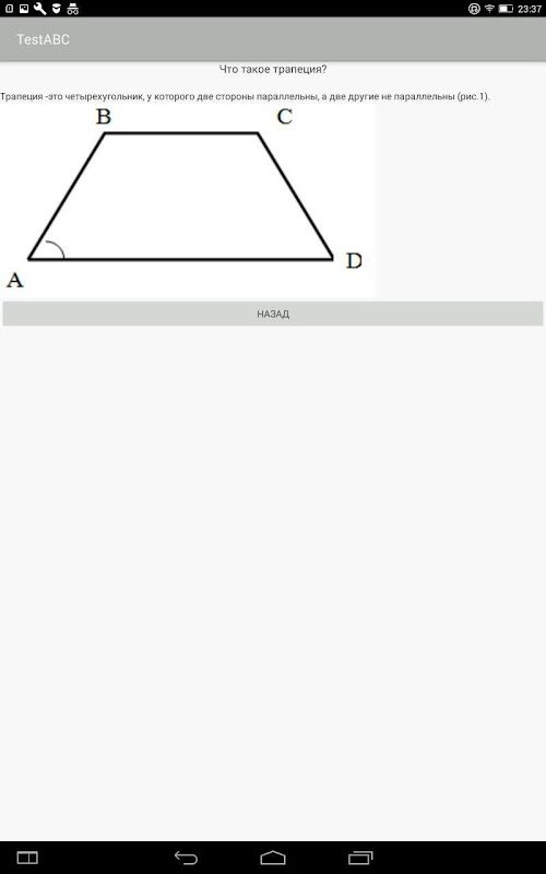 В тестах представлены вопросы по теории геометрии (определения, теоремы и аксиомы). Приложение поможет выяснить свой уровень подготовки по геометрии. Будет полезно, в основном, учащимся и поможет в любой свободный момент времени систематизировать знания.