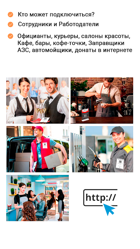 Сервис онлайн-чаевых для ресторанов, курьеров, отелей, салонов красоты, автозаправщиков, автомойщиков и других компаний.