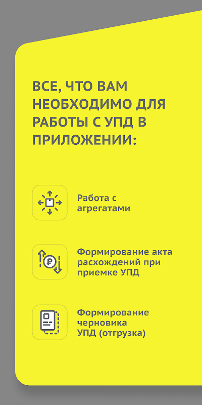 ラベルの付いた商品を扱うビジネス向けの無料モバイルアプリケーション。スマートフォンで直接、個人アカウントを使用せずにドキュメントを作成するのに役立ちます。アプリから必要なコードをスキャンし、ドキュメントを作成して、電子署名で署名するだけです。その後、自動的にシステムに移動し、個人アカウントに表示されます。