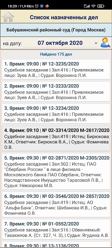 -プログラムによる情報の表示速度(ケースに関する情報を検索または表示する場合)は、プログラム要求に対する裁判所のWebサイトの応答速度(異なる場合があります)、送信される情報の量、およびインターネット接続の現在の速度に大きく依存します。さらに、事件の進行に関する情報が裁判所のウェブサイトでまったく利用できないことも珍しくありません(アプリケーションはこれについてあなたに通知します)。
