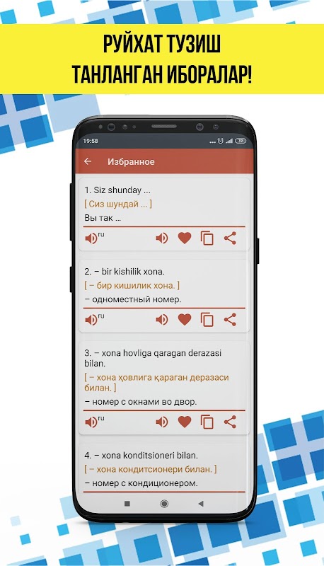❤️Сӯзлашгич тилни ӯрганиш ва яхшилашга ёрдам беради: тезкор кириш ва талаффуз қилиш учун ибораларни "севимлилар" бӯлимида сақлаш мумкин.