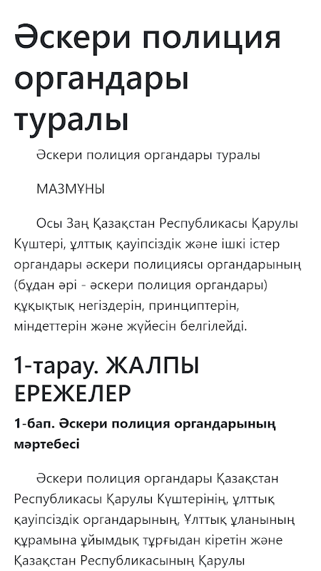 Осы Заң Қазақстан Республикасы Қарулы Күштерi, ұлттық қауiпсiздiк және iшкi iстер органдары әскери полициясы органдарының (бұдан әрi - әскери полиция органдары) құқықтық негiздерiн, принциптерiн, мiндеттерiн және жүйесiн белгiлейдi.