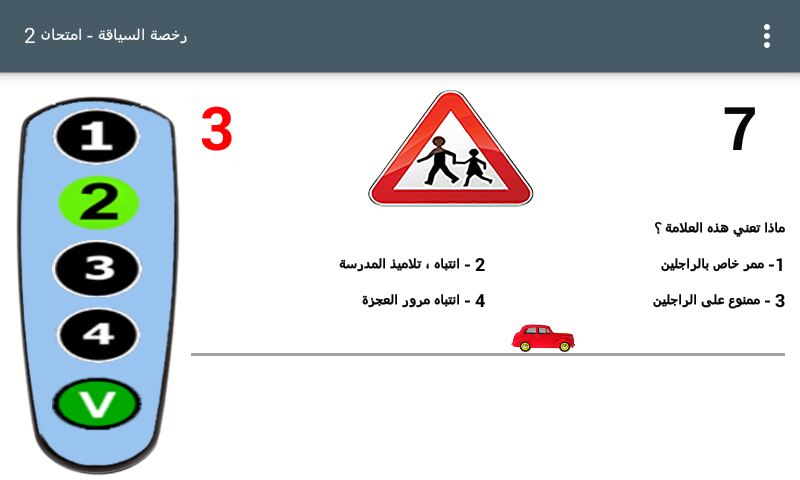 アプリケーションの内容は、質問と回答の形式で提示されます。ここでは、車を運転し、交通標識を見て、質問を読み、よく理解してから、回答することから始めます。