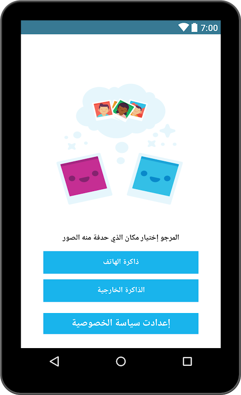 تستطيع الأن مع هذا البرنامج الذي يتجلى دوره في استرجاع الصور المحذوفة من ذاكرة سواء الهاتف أو الذاكرة الخارجية يلزم فقط تحميل وفتح البرنامج وإتباع الاختيارات وستقوم باسترجاع صورك المحذوفة لأن برنامجنا يقوم باسترجاع الصور وحفظها في هاتفك بكل بساطة
