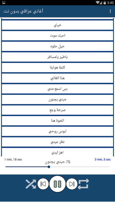 このアプリケーションは、最も素晴らしい100のイラクの歌を含み、アプリケーションの曲が変化することを特徴としています。そのため、ロマンチックな歌、悲しい歌、愛と非難の歌、ダブカットとイラクの歌、そして静かな歌、愛の歌、若者の歌、そして新しい悲しい歌が含まれています。
