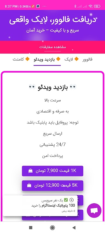 با این برنامه میتونید بسته های متنوع لایک و فالوور و کامنت و ... را براحتی استفاده کنید.
