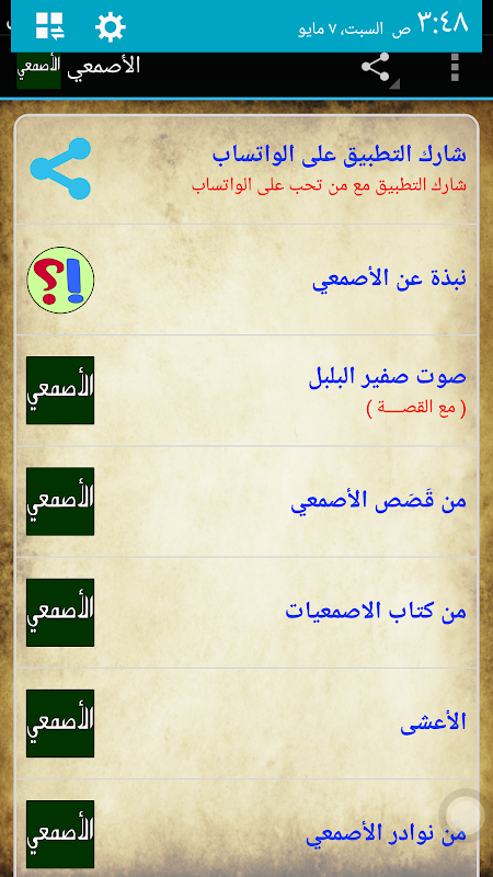 これは、アブナワスに言った:アブUbaidaはAsma'iと合理的にもたらした、と彼は言った:アブObeidaは、彼らが最初にOmknuhニュース、その他、およびAsma'i Vbulbul Atrabhm Bengmathをそれらを読むと述べました。