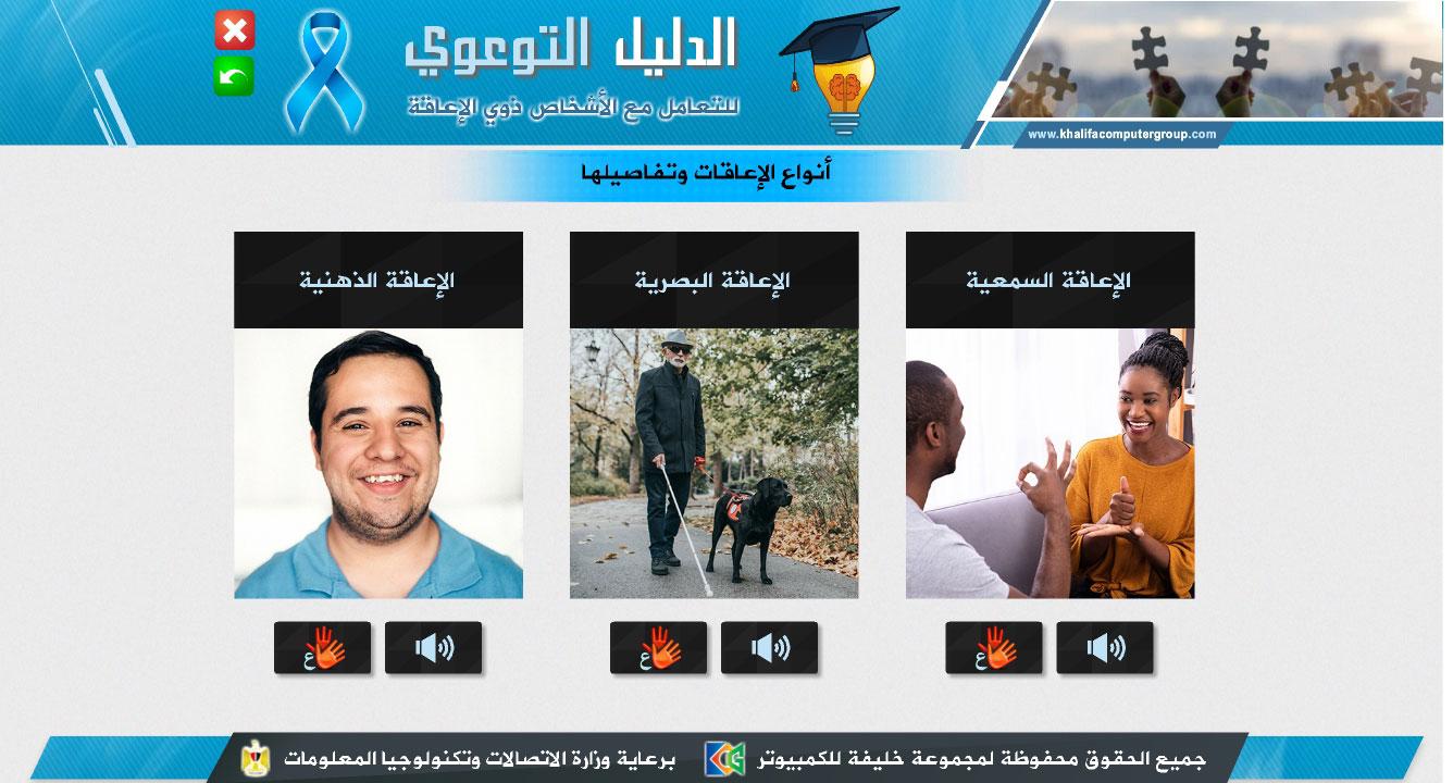 هذا التطبيق متاح بلغة الاشارة للصم وبالصوت للمكفوفين وضعاف السمع حيث يمكن استخدامه من كافة الأشخاص ذوي الاعاقة