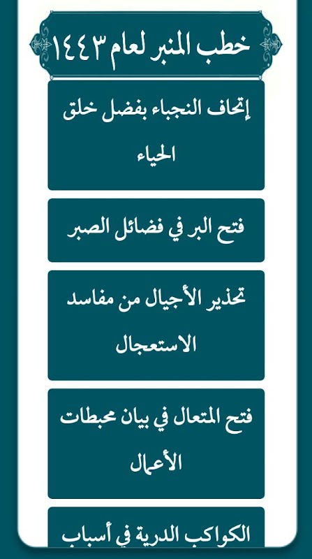 世界の主なる神に讃美あれ。私は神のみでパートナーもいないことを証します。ムハンマドが神の僕であり使者であることを証します。彼とその家族に神の祈りと平安がありますように。以下に続くことに関して言えば、これらは、神に讃美あれ、神が千四百四十二年と千四百四十三年に促進してくださった私の説教です。私たちの名誉ある兄弟、アブ・アブドゥッラー・ジヤード・アル・マリキ、神が彼を守り、それを手配し、このプログラムに入れてくださいますように、私たちの高潔な兄弟、アブ・ムハンマド・バセム・アル・アサウリ、神が彼を守ってくださいますように、神がこのことに対して二人に善意をもって報いてくださいますようにこの仕事は、イスラム教とイスラム教徒に利益をもたらし、その名誉ある御顔のために清らかにして、私たち全員を至福の園に導いてくださるよう、神にお願いするものである。一千四百四十五年。