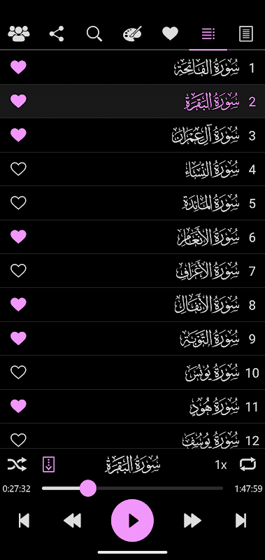 コーラン全体、テキストと音声、お気に入り、検索、読み上げ速度の制御、色の制御