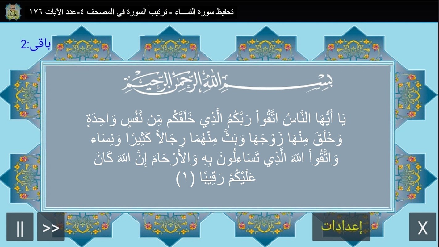 教師のクルアーン パート (4-->5-->6) Surat Al-Nisa クルアーンのスーラの順序は (4) その節の数は (176)