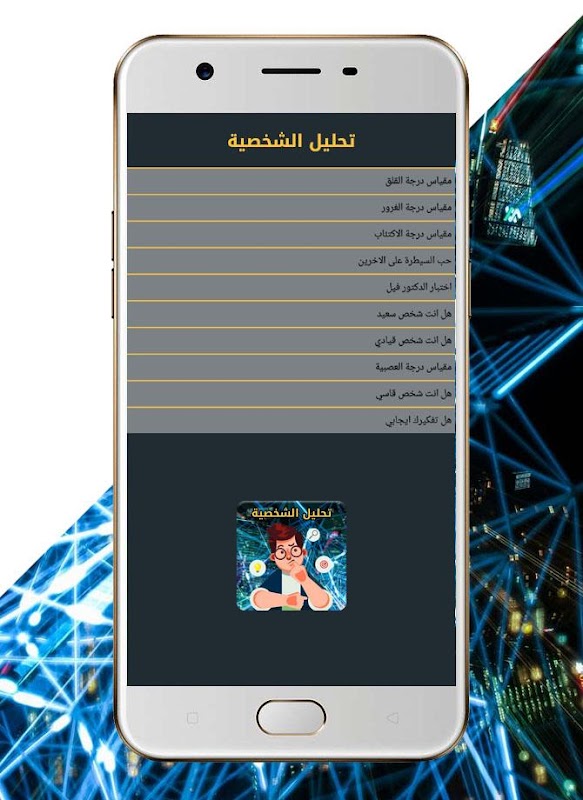 يحتوي التطبيق على سلسلة من الاسئلة التي تتعلق باكثر من جانب من جوانب الشخصية و تحلل الشخصية من عدة نواح
