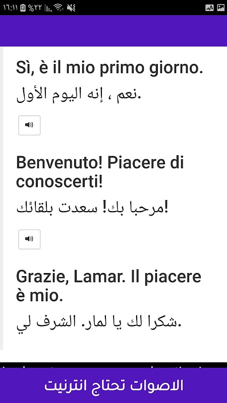 各単語とすべての文はイタリア語で書かれ、アラビア語でも書かれているため、ユーザーは単語や文の発音を知ることができます。