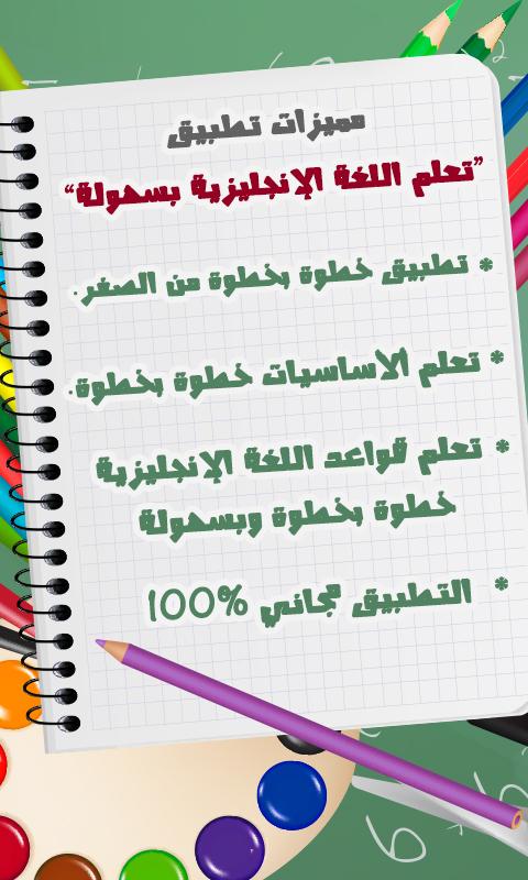 - تعلم اللغة الانجليزية مجانا حيث التطبيق مجاني 100% للابد وبتحديثات مستمرة.