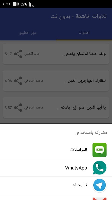 يتيح لك التطبيق مشاركة التلاوة بواسطة أي تطبيق ..