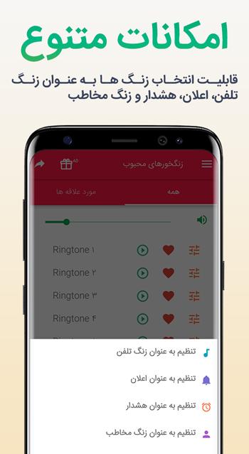 - دارای چهار بخش زنگ تلفن ، زنگ اعلان، زنگ ساعت و لیست علاقه مندی های شما