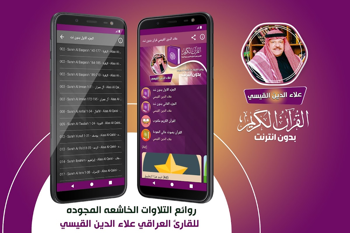 🔹聖クルアーンアプリケーションには、インターネットなしでコーランのスーラを聞いている読者のアラアルディンアルカイシの声が含まれており、コーランの無料朗読のためのこのアプリケーションが特徴です。