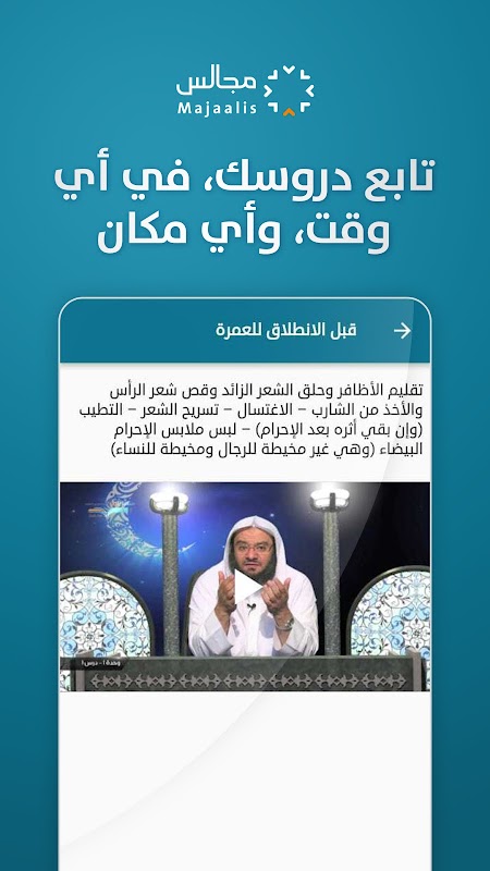 「Majalis」アプリケーションは、知識を学ぶ学生のシャリーア学習を促進するように設計されています。これを通じて、電話を通じて学習するプラットフォーム上のすべての授業や科学コースを受講できます。インターネットが中断された場合でも、視聴することができます。レッスンをしたり、簡単にレッスンに戻ったりできます。