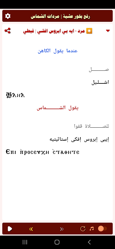- 前夜に最初に香をあげてからミサが終わるまで、執事の聖歌はすべてコプト語とアラビア語で教師ガド・ルイスの声で聞こえます。