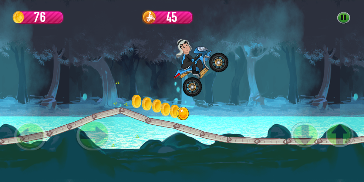 قم بالقيادة باستعمال السهمين الأمامي والخلفي وحافض على توازن الدراجة باستعمال سهمي الأعلى و الأسفل لتحريك مقدمة الدراجة نحو الأسفل والأعلى