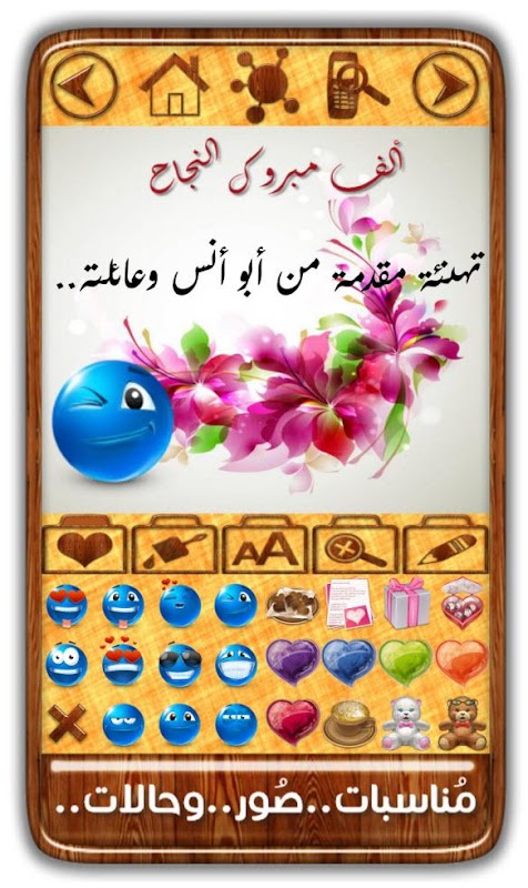 وهناك إمكانية تعديل الخط من حيث الحجم واللون والنوع (هناك 8 أنواع خطوط جميلة)، وكذلك إضافة صور تعبيرية جميلة حسب المناسبة والحالة..